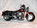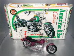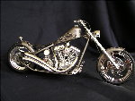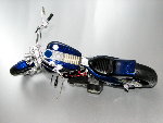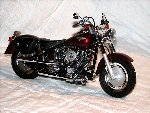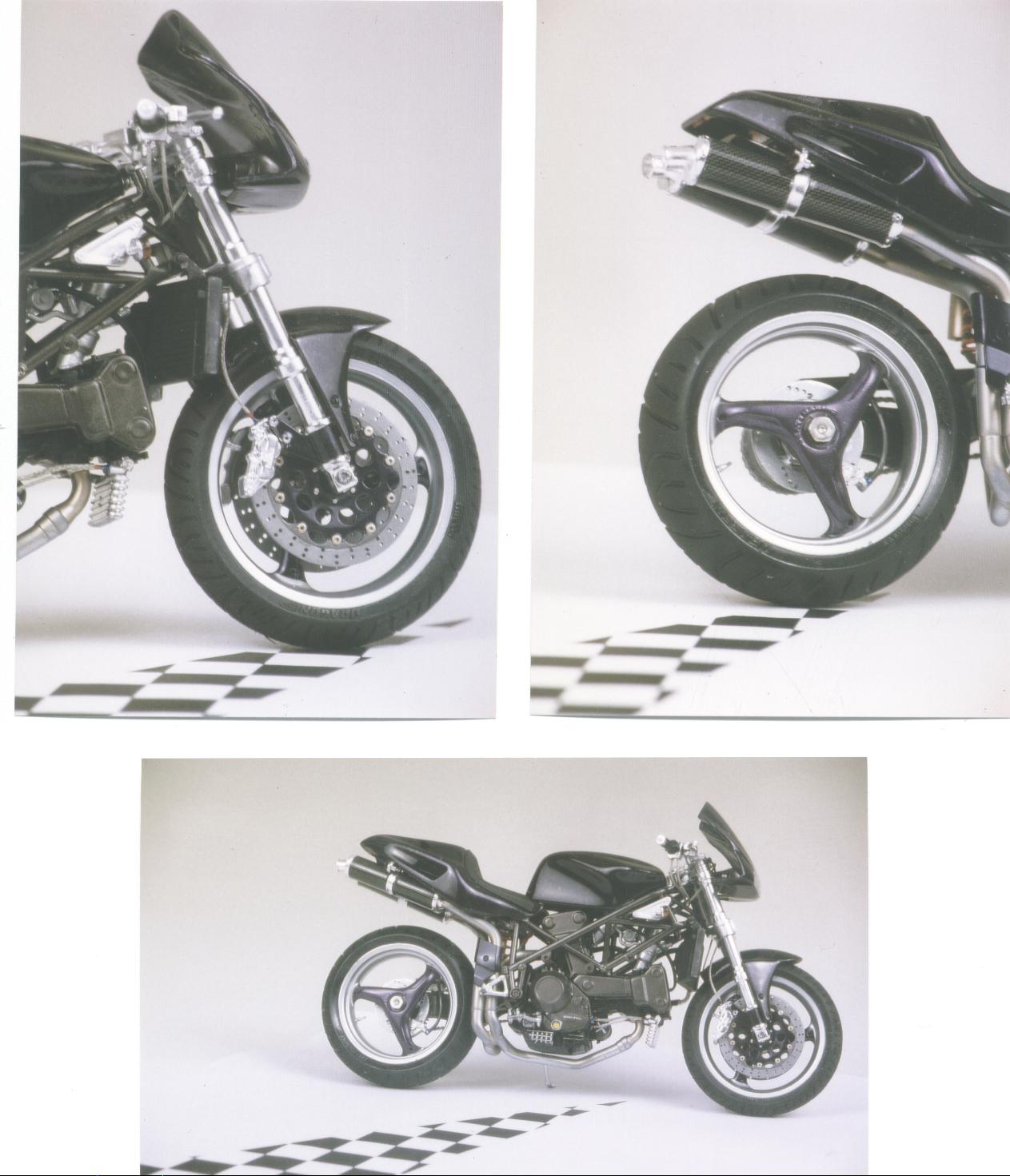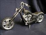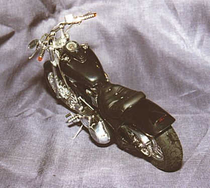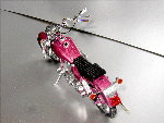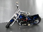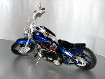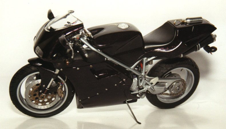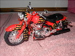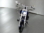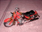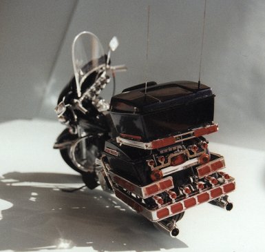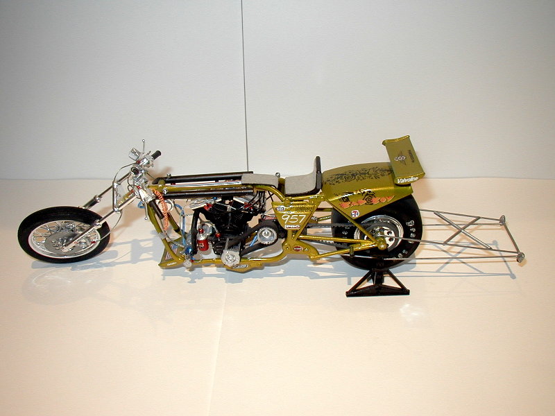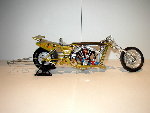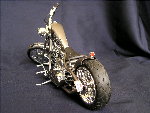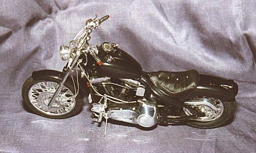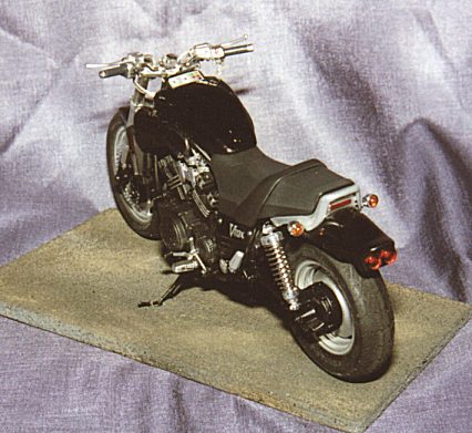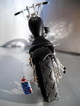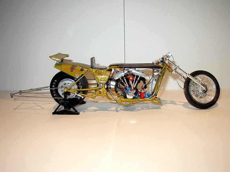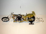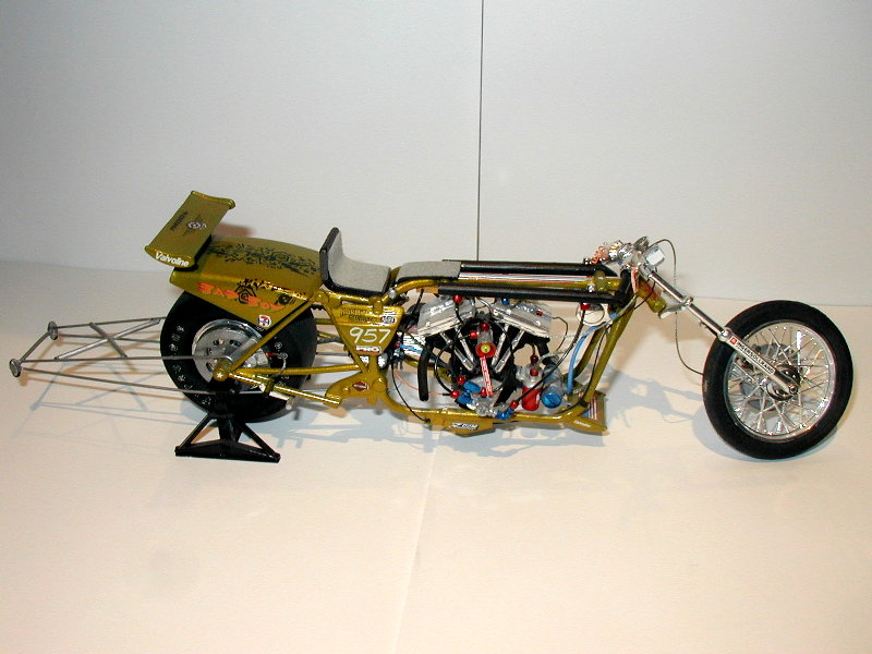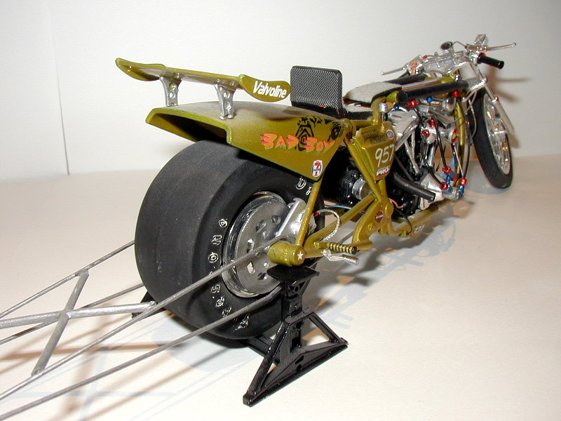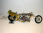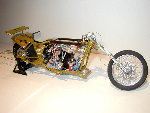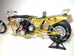 Das Bike habe ich komplett Scratch gebaut. Der Rahmen stammt von einer BMW R 100, wurde verlängert und mit einem Hilfsrahmen hinten versehen. Der Slick ist aus einem Funny Car Bausatz. Den Rest aufzuzählen würde den Rahmen hier sprengen. Baubericht in Modell Fan 1/2001  |